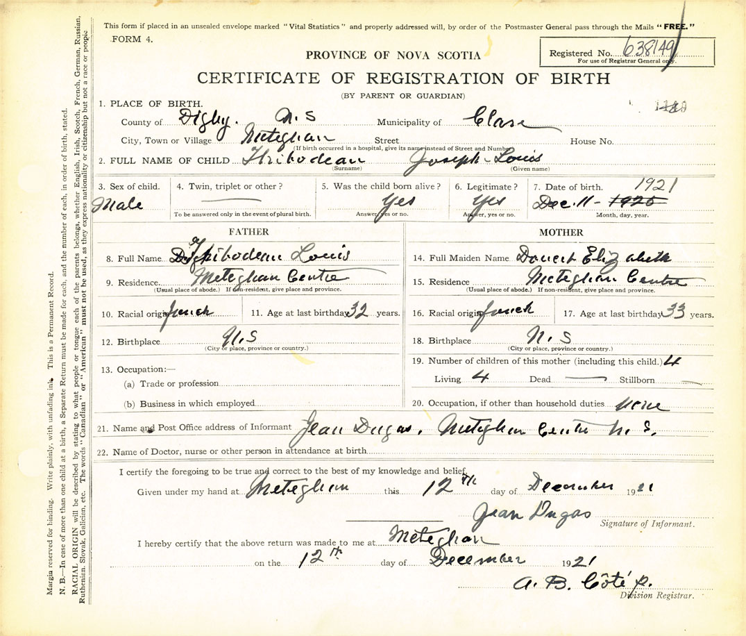 21. Name and Post Office address of Informant Jean Dugas Meteghan Centre