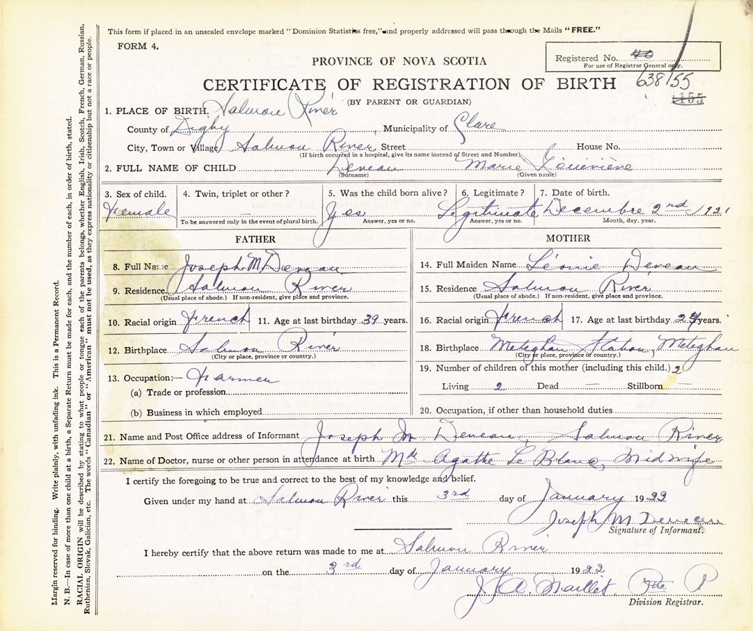 22. Name of Doctor, nurse or other person in attendance at birth Madame Agathe LeBlanc (Midwife)