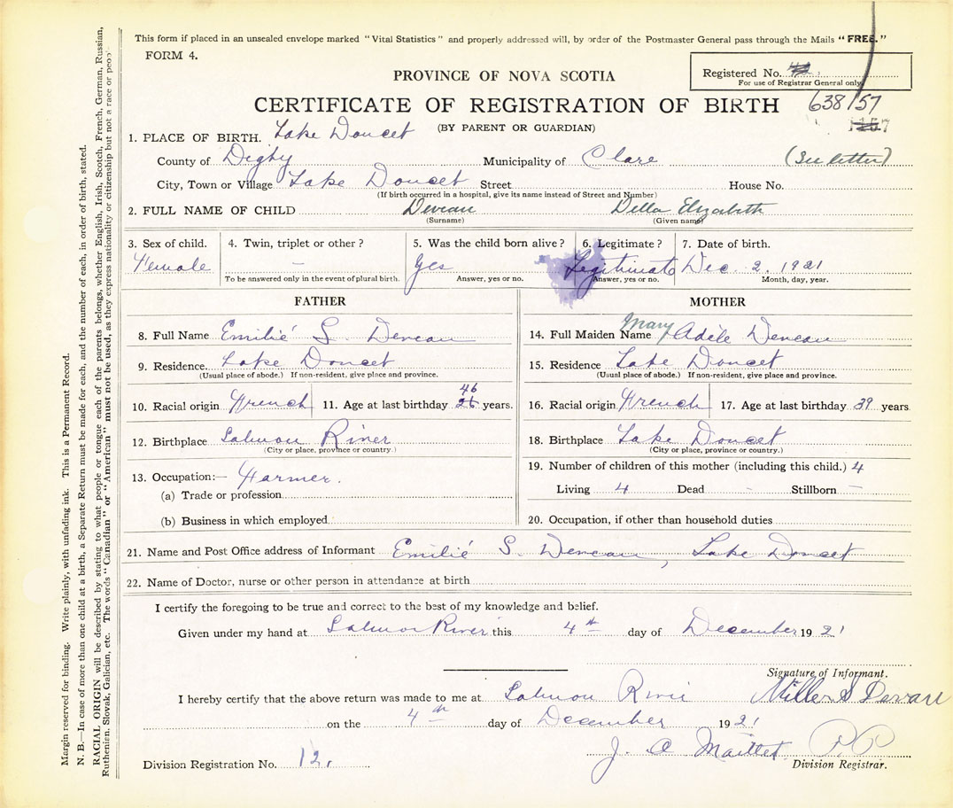 21. Name and Post Office address of Informant Emilie S. Deveau Lake Doucette
