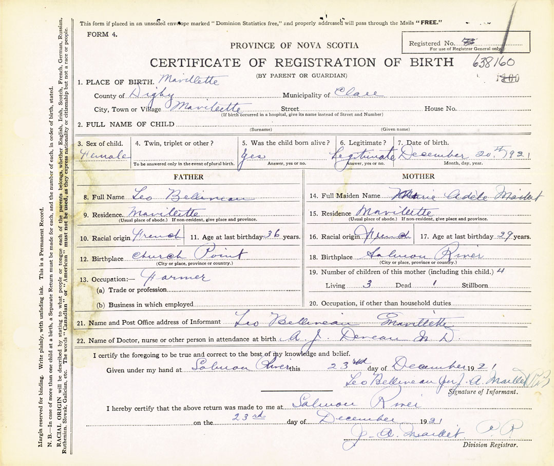 21. Name and Post Office address of Informant Leo Belliveau Mavilette