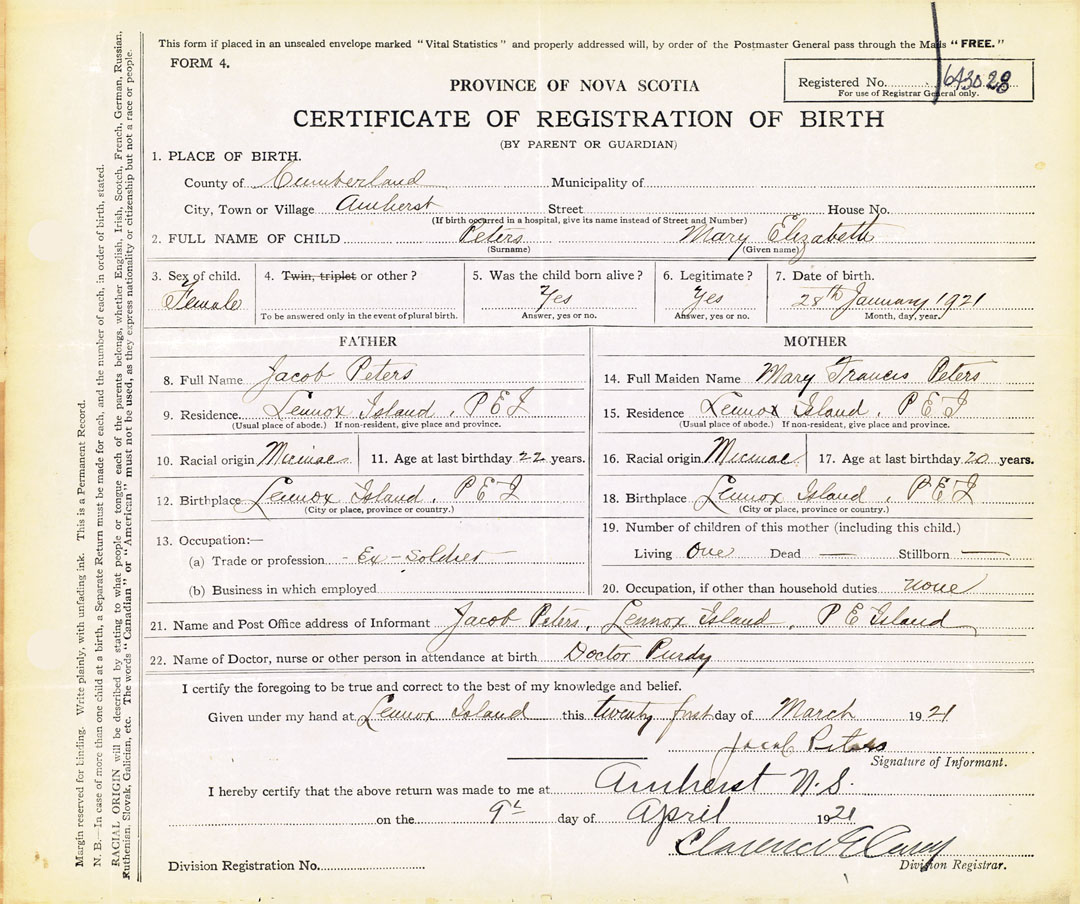 21. Name and Post Office address of Informant Jacob Peters Lennox Island, PE Island
