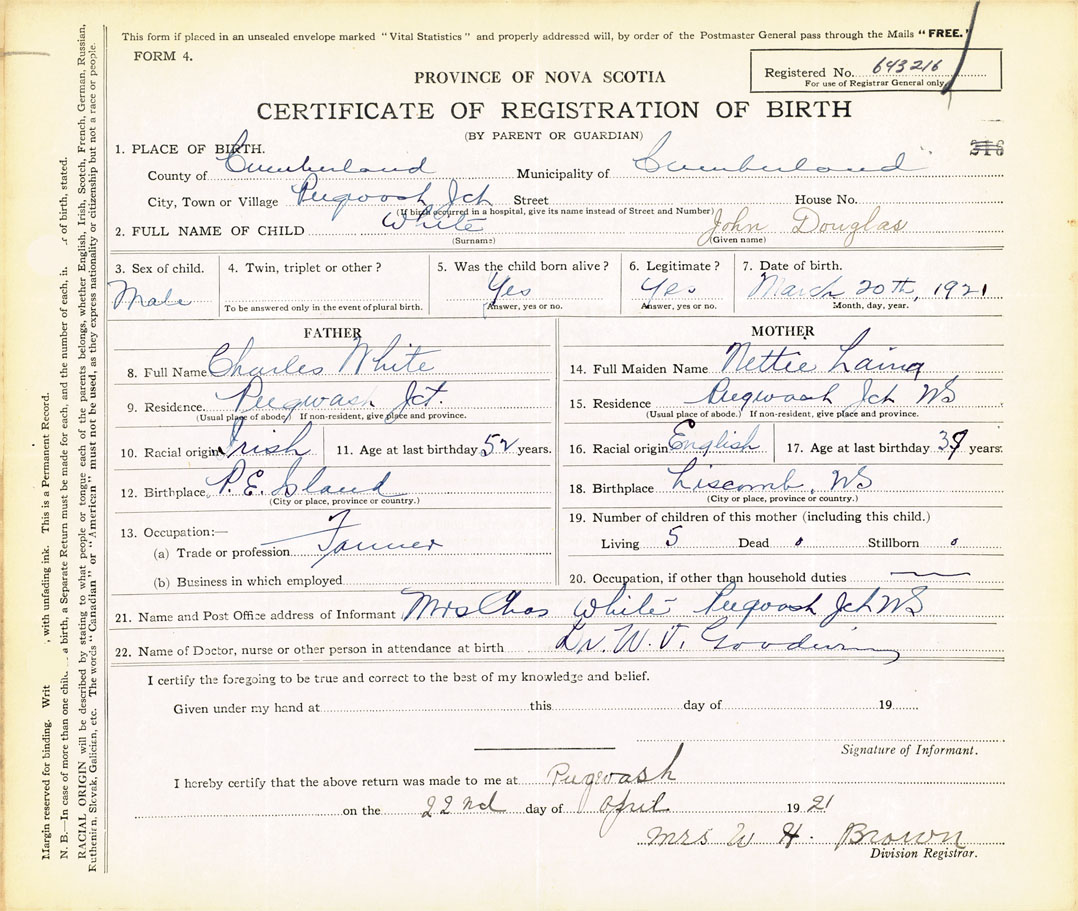 21. Name and Post Office address of Informant Mrs. Charles White Pugwash Jct.