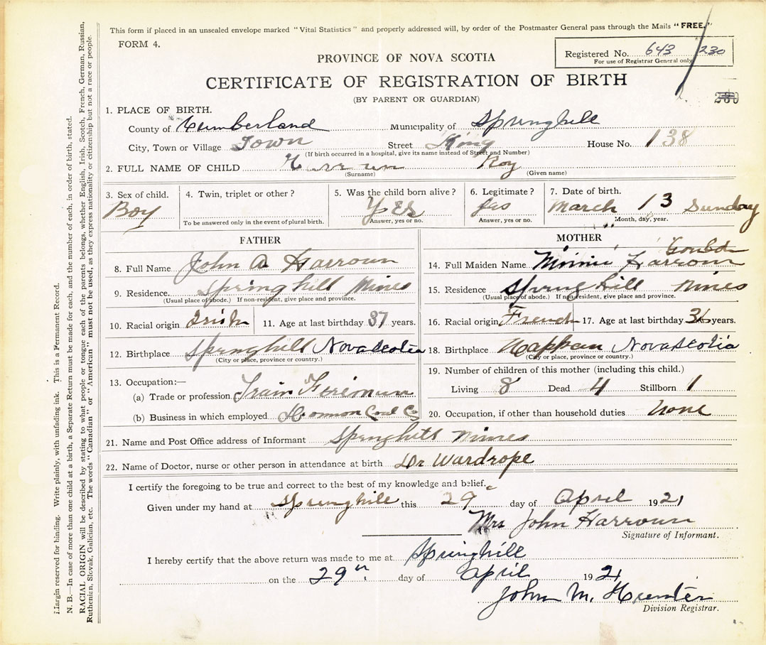 21. Name and Post Office address of Informant Mrs. John Harroun Springhill Mines