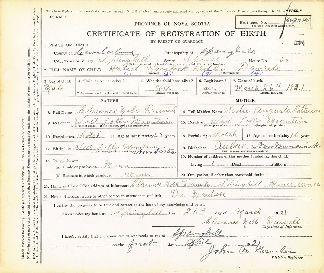 21. Name and Post Office address of Informant Clarence Noble Daniels Springhill Mines, Cumb.