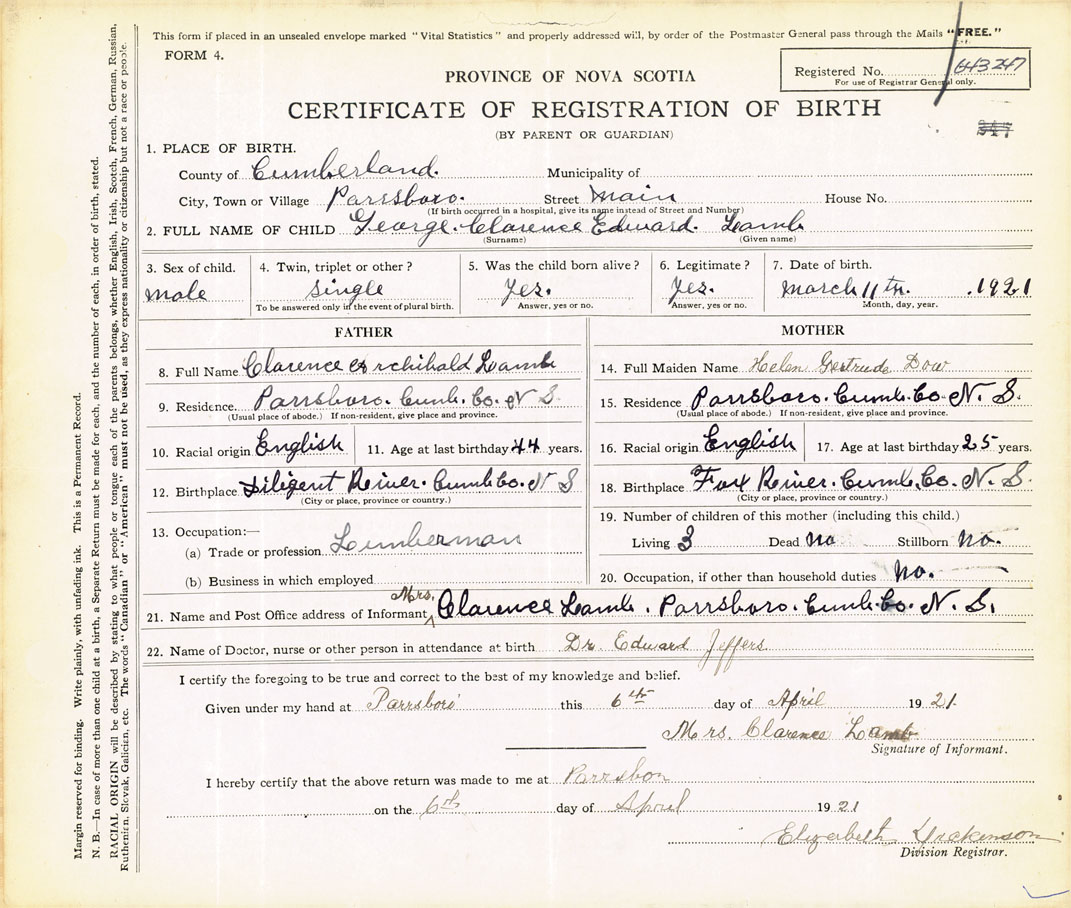 21. Name and Post Office address of Informant Mrs. Clarenc Lamb Parrsboro, Cumberland