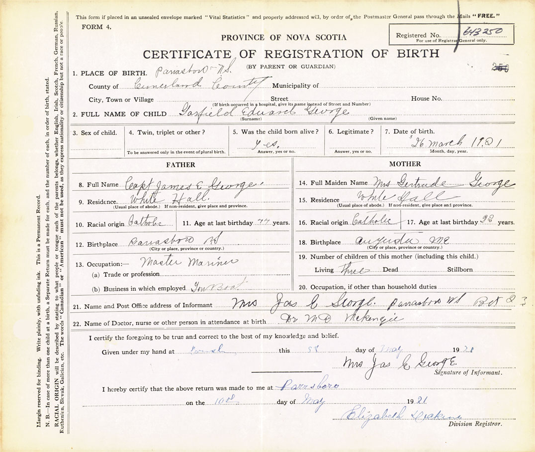 21. Name and Post Office address of Informant Mrs. Jas. E. George Parrsboro, Cumberland box 23