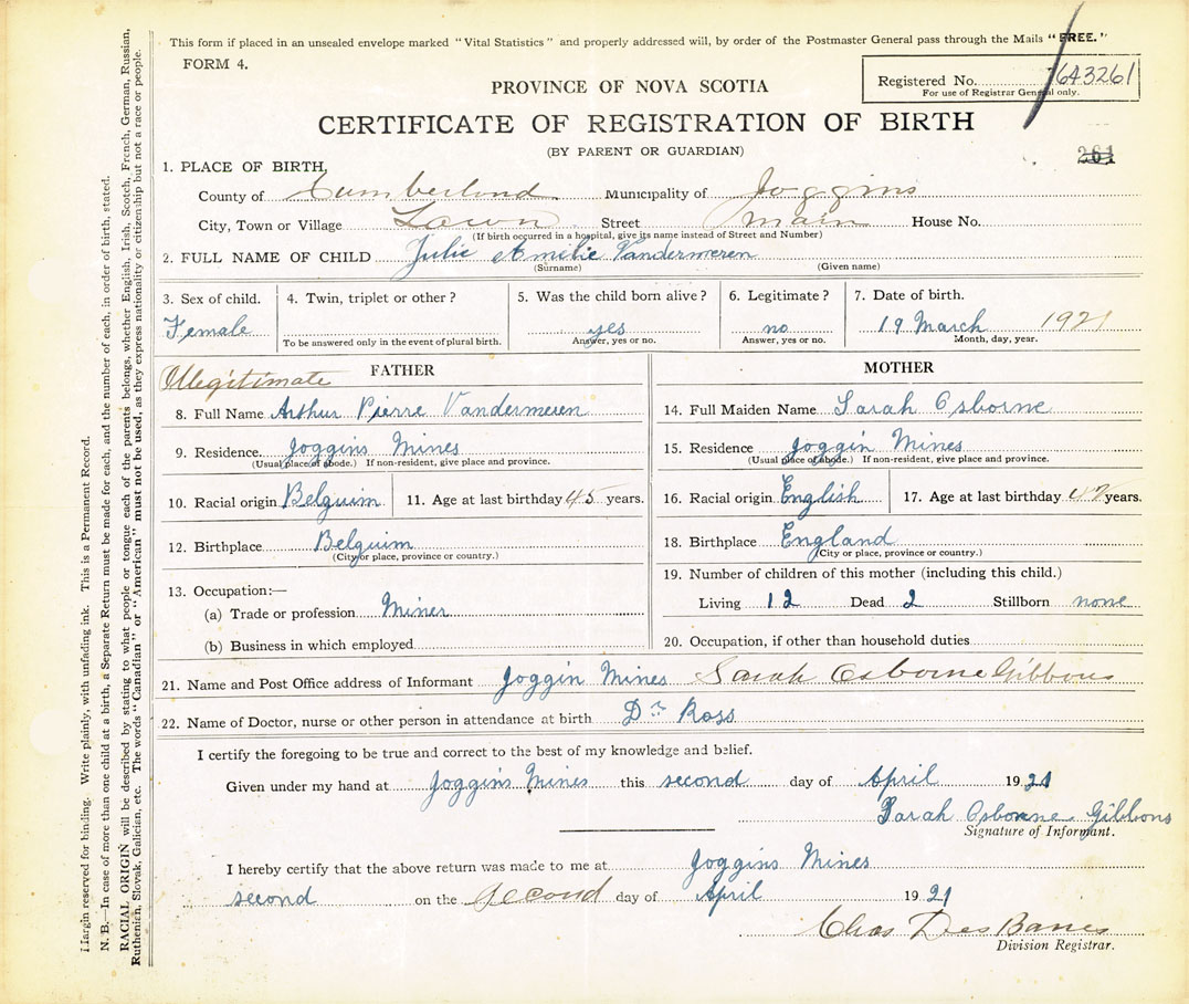 21. Name and Post Office address of Informant Sarah Osborne Gibbons Joggins Mines, Cumberland