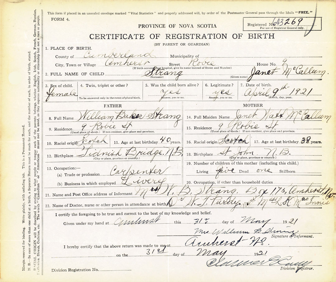 21. Name and Post Office address of Informant Mrs. William B. Strang Box 175, Amherst, Cumberland