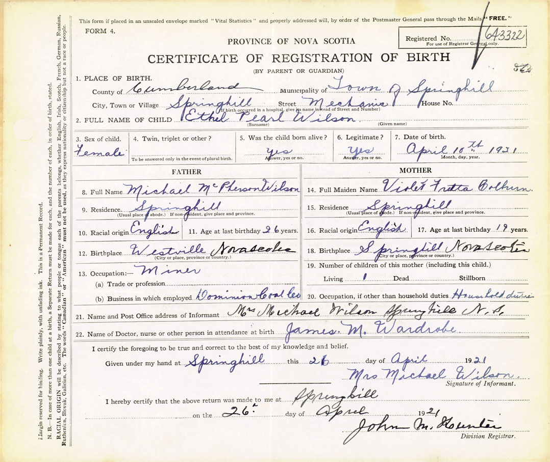 21. Name and Post Office address of Informant Mrs. Michael Wilson Springhill Nova Scotia