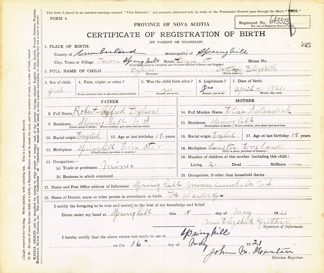 21. Name and Post Office address of Informant Mrs. Elizabeth Guthro Springhill Mines, Cumb.