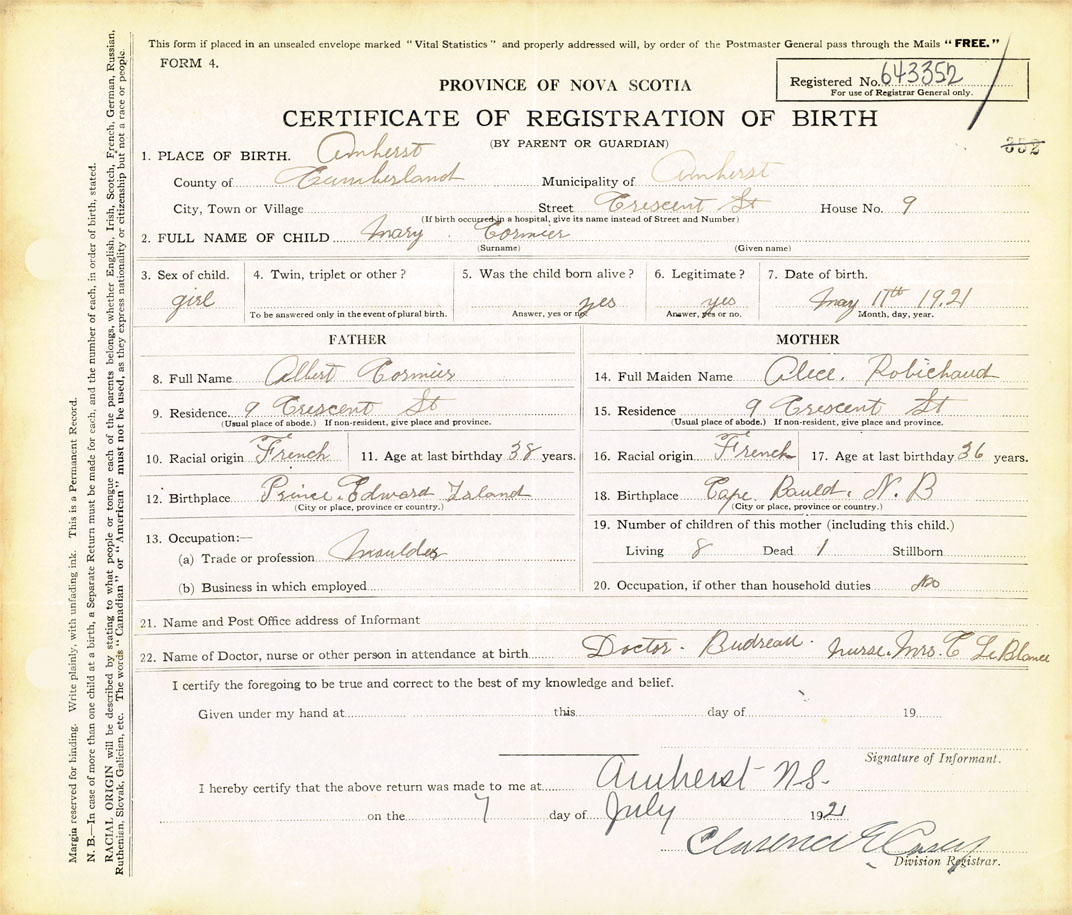 22. Name of Doctor, nurse or other person in attendance at birth Doctor Boudreau, Nurse Mrs C LeBlanc