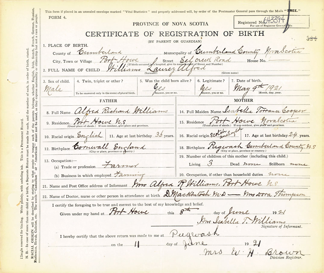 21. Name and Post Office address of Informant Mrs. W.H. Brown Pugwash