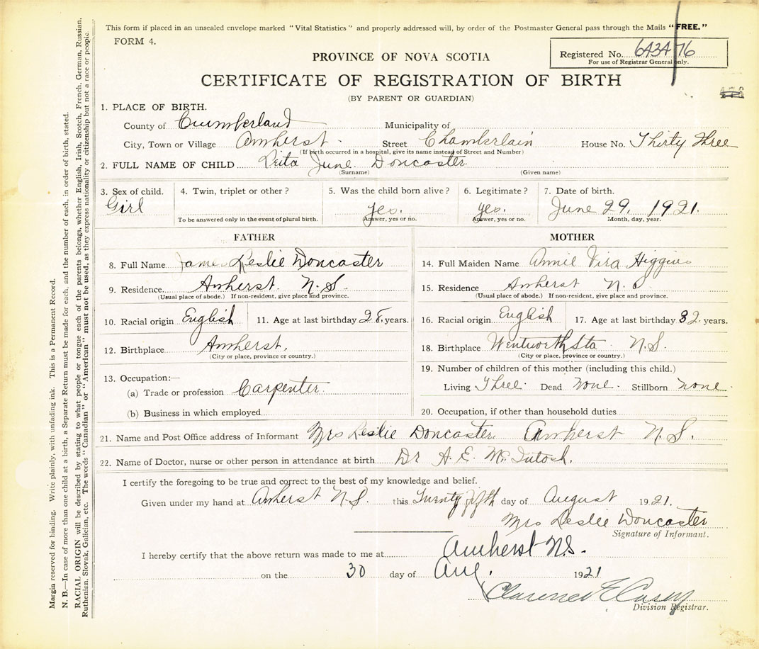 21. Name and Post Office address of Informant Mrs Leslie Doncaster Amherst, NS
