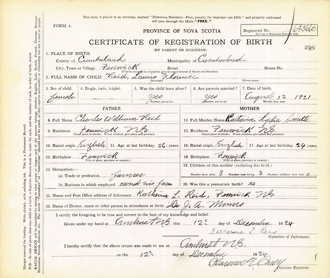 21. Name and Post Office address of Informant Katherine L. Reid Fenwick, Cumberland Co, NS