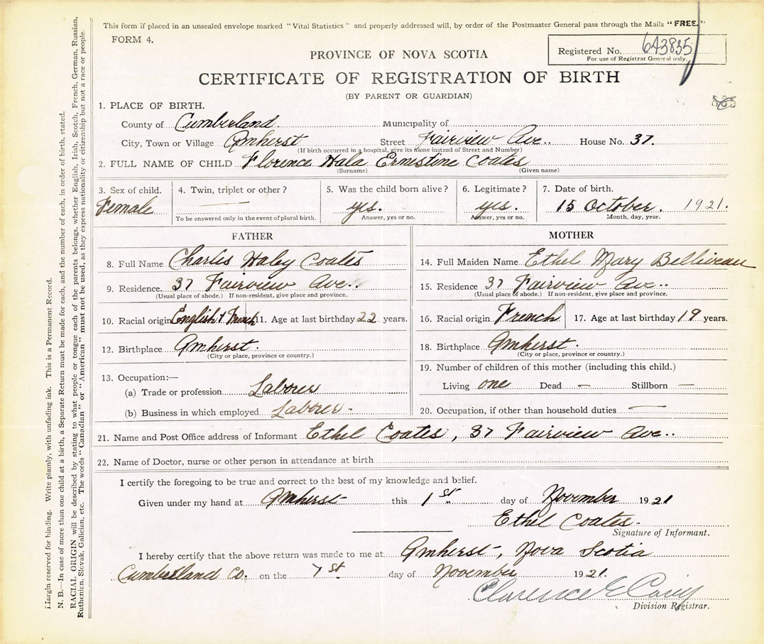 21. Name and Post Office address of Informant Ethel Coates 37 Fairview Avenue, Amherst, Cumberland