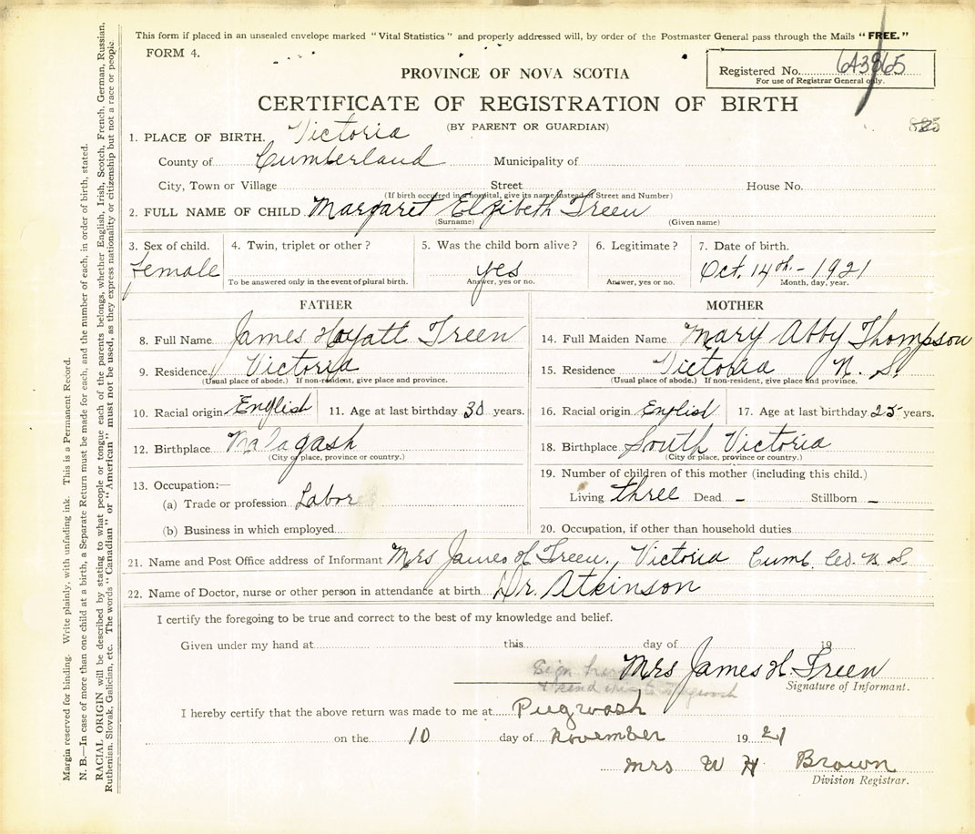 21. Name and Post Office address of Informant Mrs James H Green Victoria, Cumb. Co