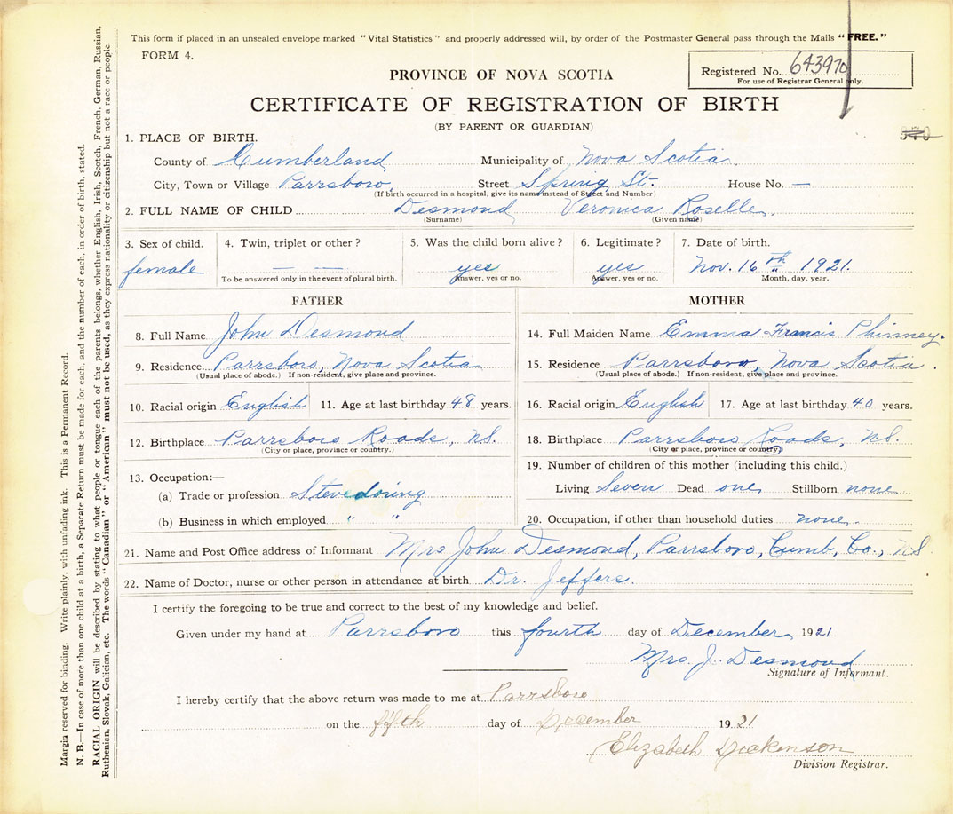21. Name and Post Office address of Informant Mrs. John Desmond Parrsboro