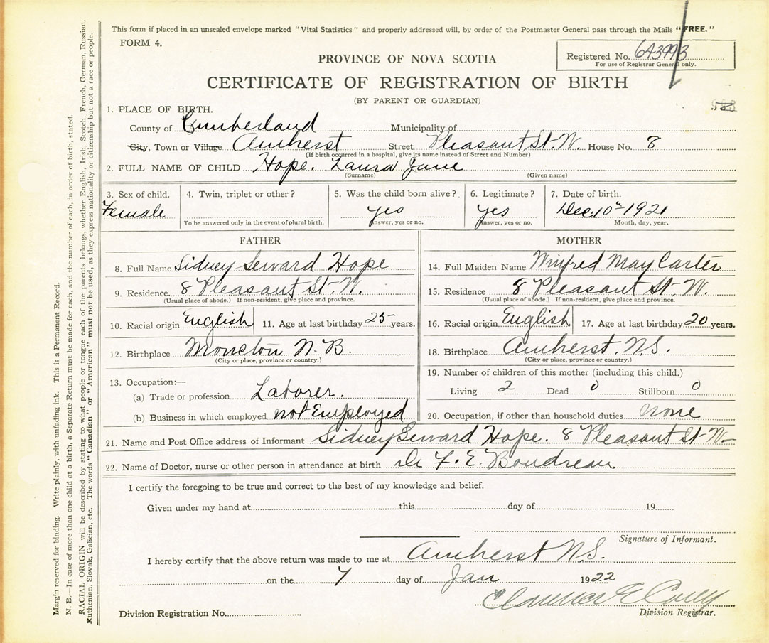 21. Name and Post Office address of Informant Sidney Seward Hope 8 Pleasant Street West, Amherst, Cumberland Co., NS