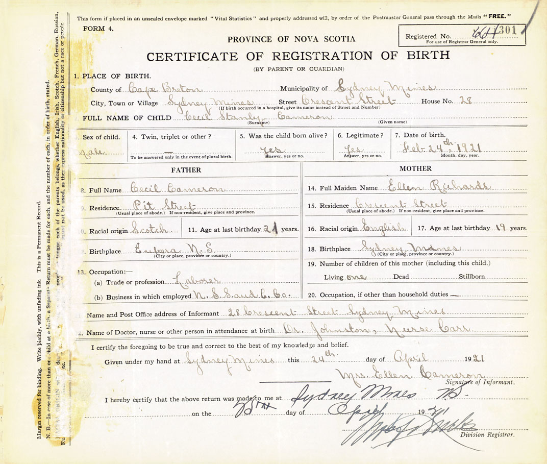 21. Name and Post Office address of Informant Mrs. Ellen Cameron Crescent St. Sydney Mines
