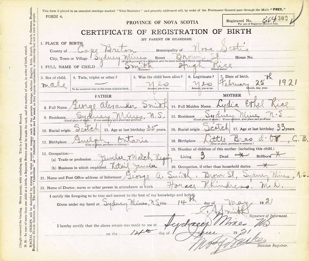 21. Name and Post Office address of Informant George A. Smith Brown St. Sydney Mines