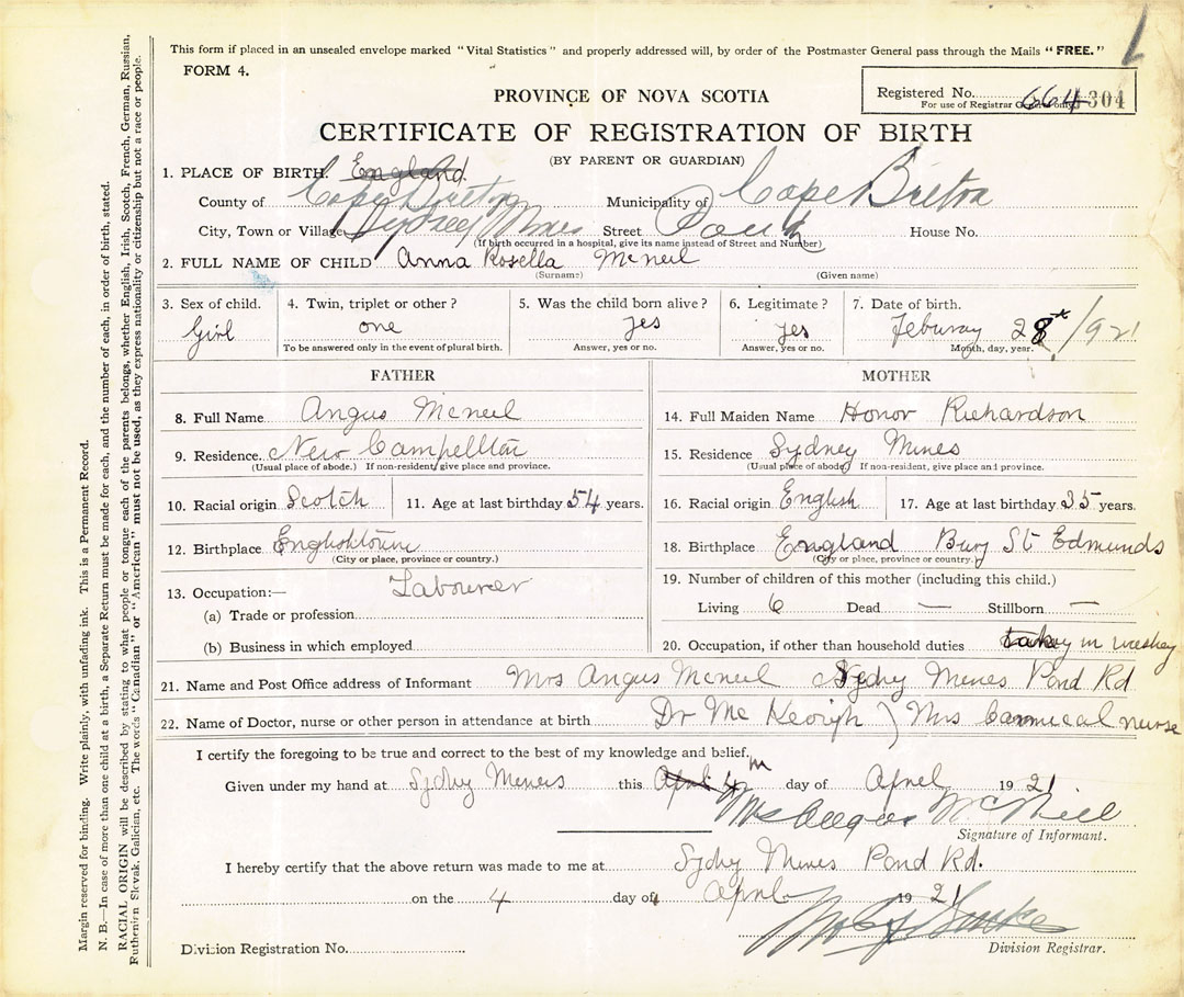 21. Name and Post Office address of Informant Mrs. Angus McNeil Sydney Mines