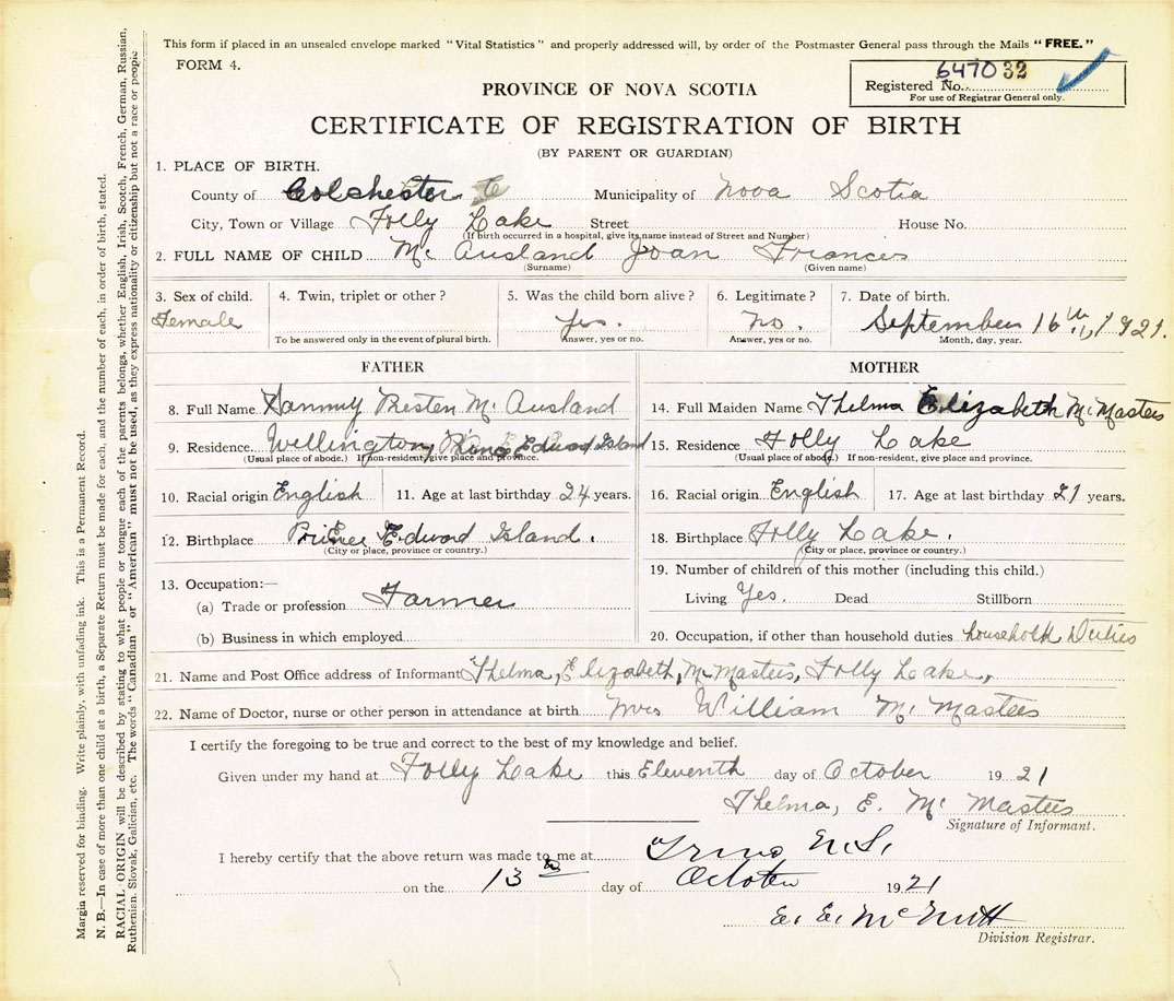 21. Name and Post Office address of Informant Thelma Elizabeth McMasters Folly Lake, Colchester