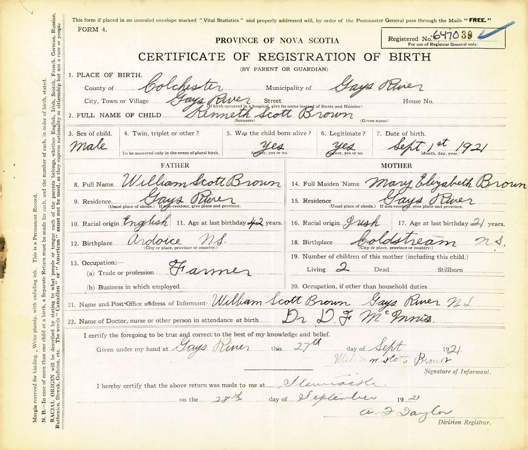 21. Name and Post Office address of Informant William Scott Brown Gays River, NS