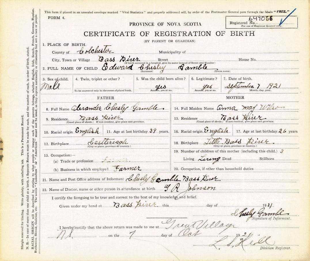 21. Name and Post Office address of Informant Chesley Gamble Bass River, Colchester