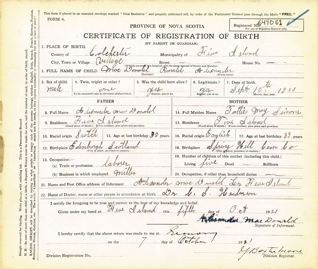 21. Name and Post Office address of Informant Alexander MacDonald Lower Five Islands, Colchester Co., NS