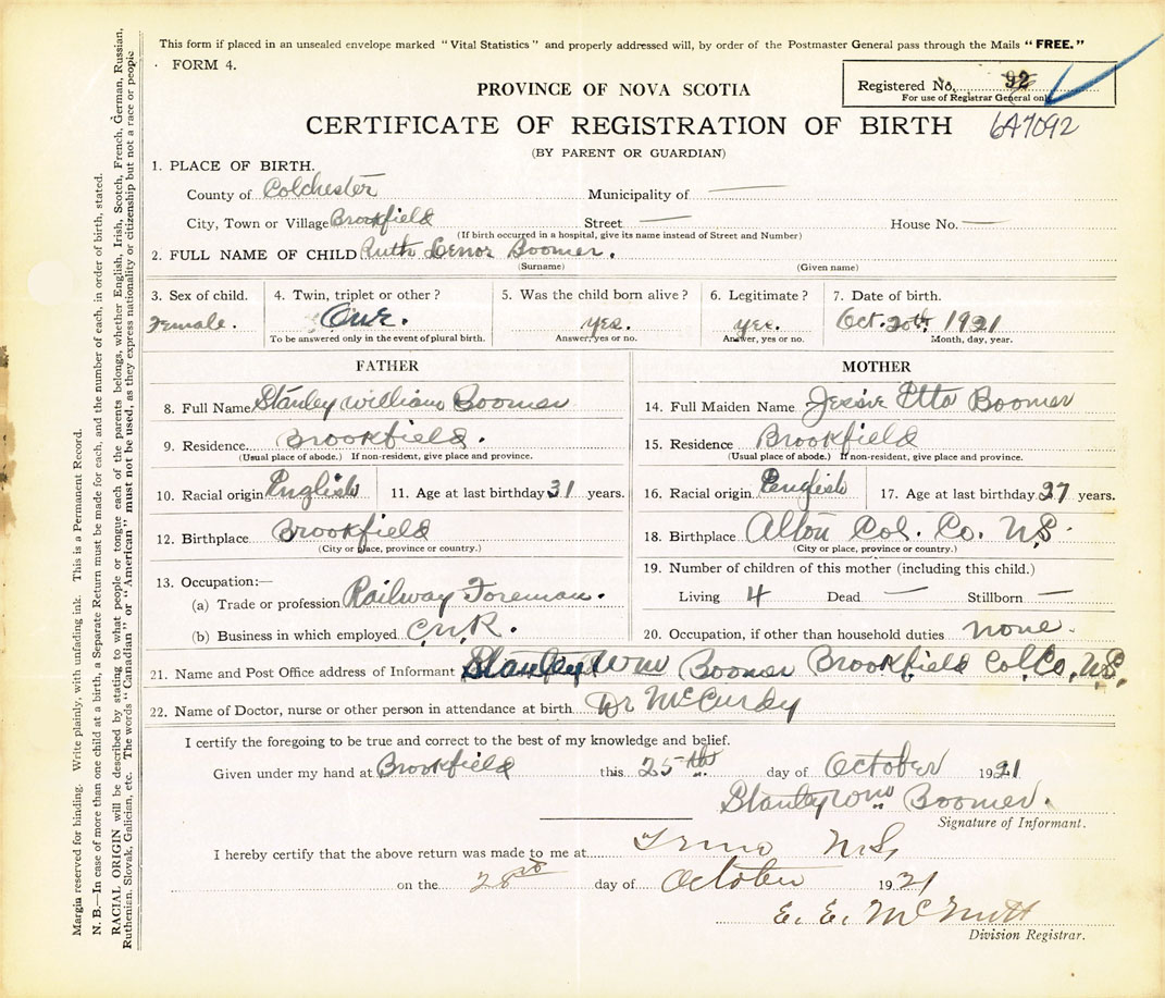 21. Name and Post Office address of Informant Stanley Wm Boomer Brookfield, Colchester County