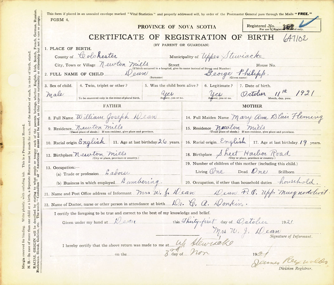 21. Name and Post Office address of Informant Mrs. W. J. Dean Upper Musquodoboit, Halifax