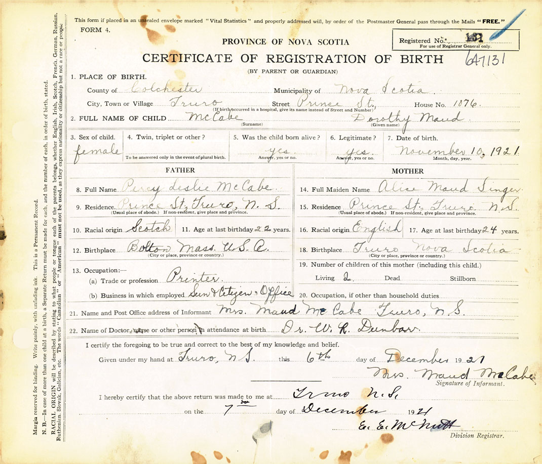 21. Name and Post Office address of Informant Mrs. Maud McCabe Truro, Colchester