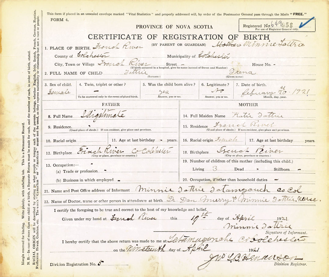 21. Name and Post Office address of Informant Minnie Tattrie Tatamagouche, Colchester