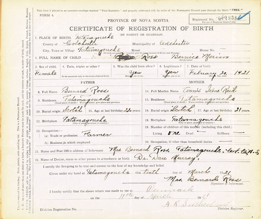 21. Name and Post Office address of Informant Mrs. Bernard Ross Tatamagouche, Colchester