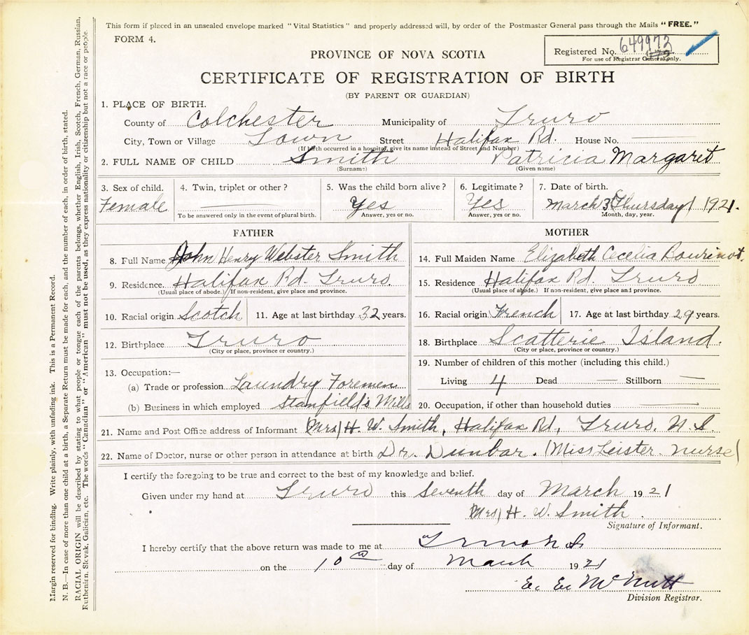 21. Name and Post Office address of Informant Mrs. H. W. Smith Halifax Road, Truro, Colchester