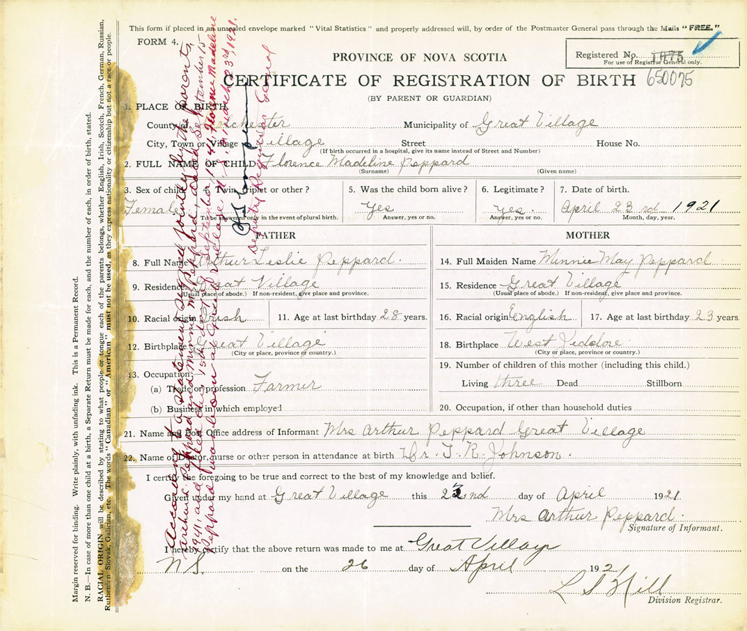 21. Name and Post Office address of Informant Mrs. Arthur Peppard Great Village