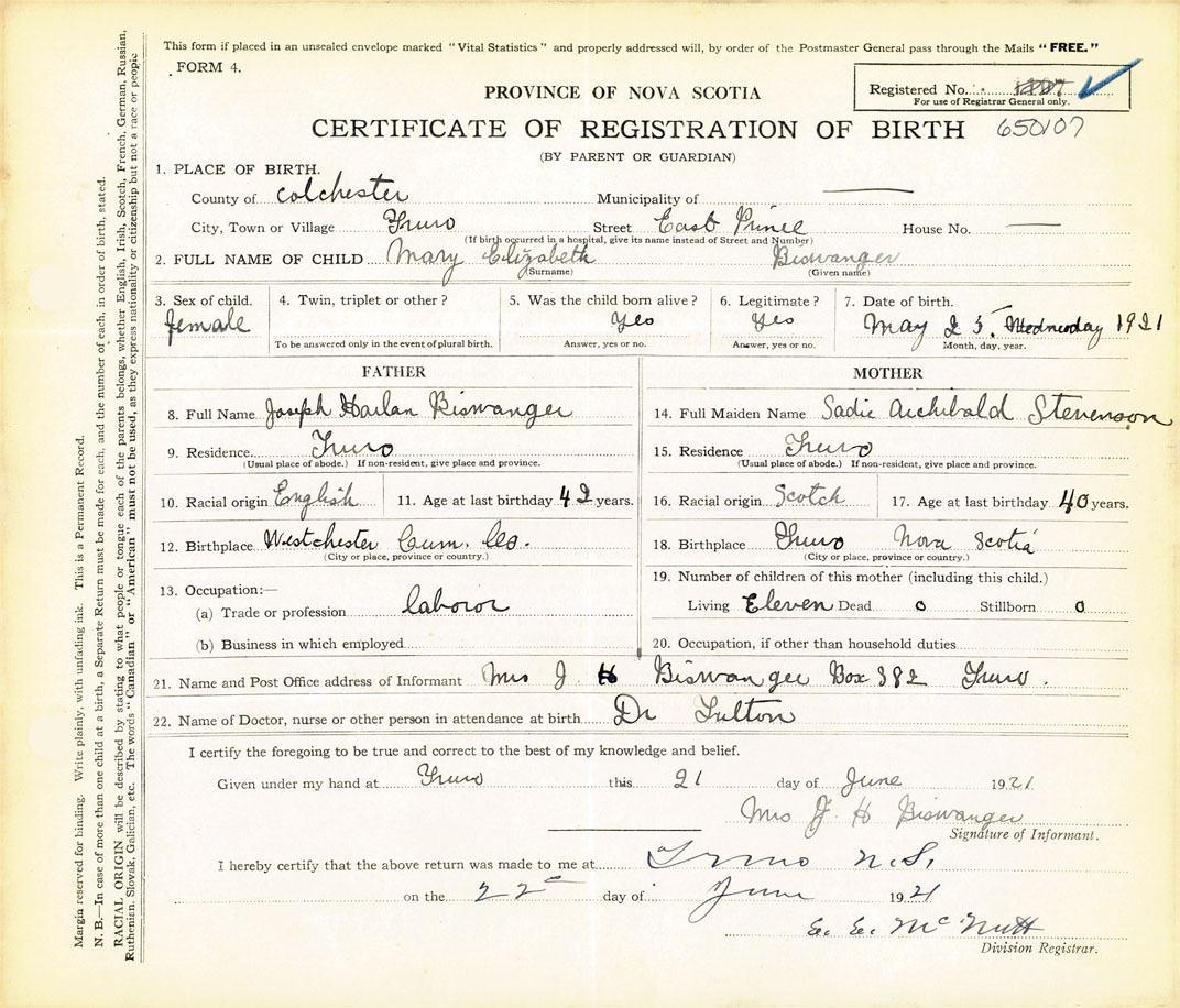 21. Name and Post Office address of Informant Mrs. J.H. Biswanger Truro