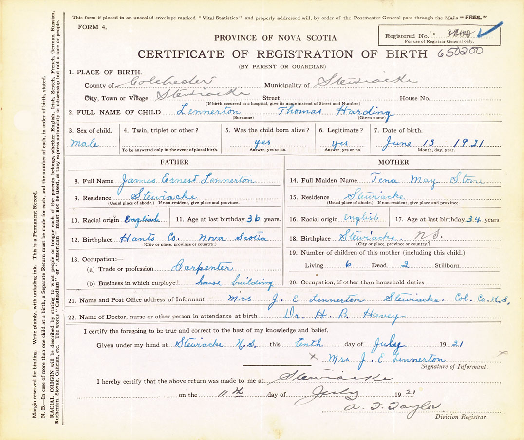 21. Name and Post Office address of Informant Mrs. J.E. Lennerton Stewiacke