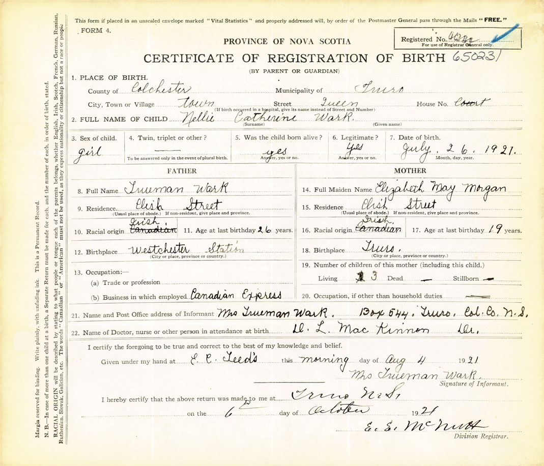 21. Name and Post Office address of Informant Mrs. Trueman Wark Box 544, Truro, Colchester