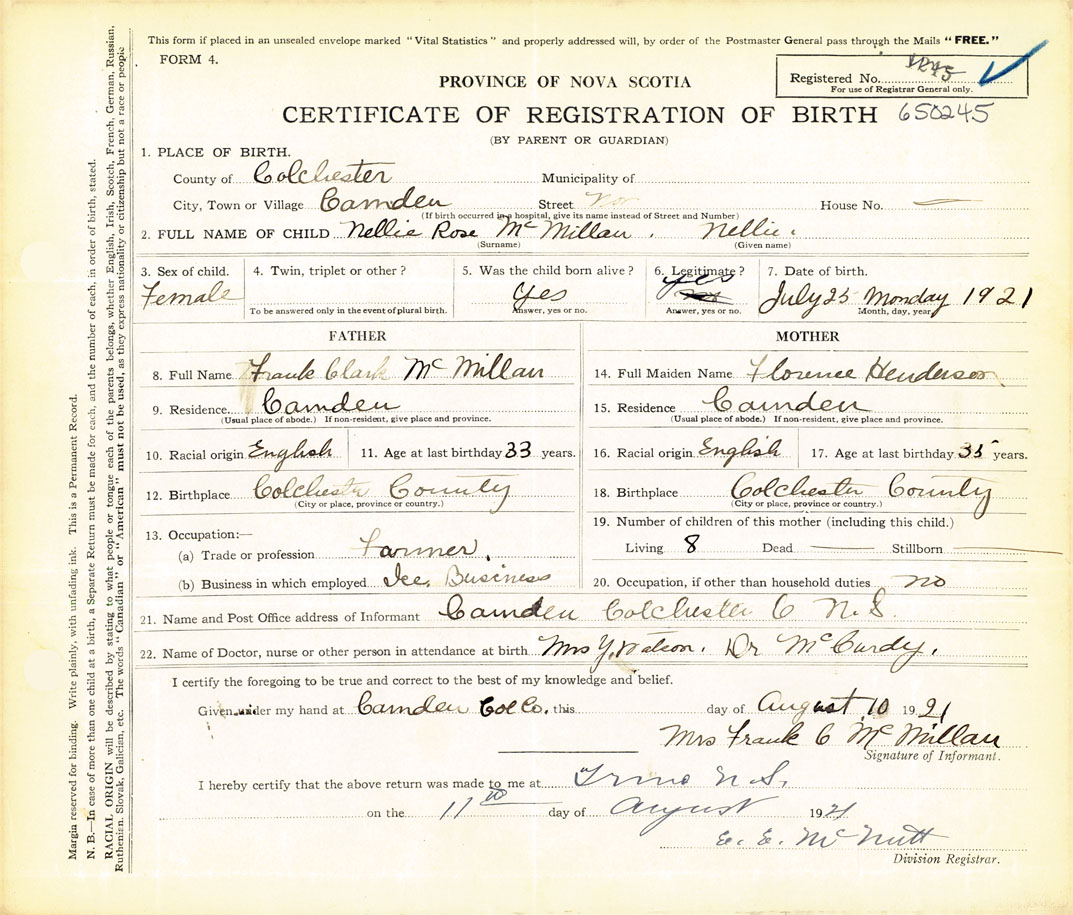 21. Name and Post Office address of Informant Mrs Frank C McMillan Camden, Colchester Co