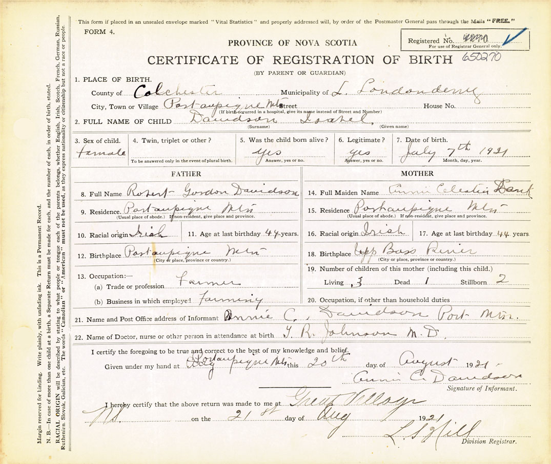 21. Name and Post Office address of Informant Annie C. Davidson Portapique Mountain, Colchester