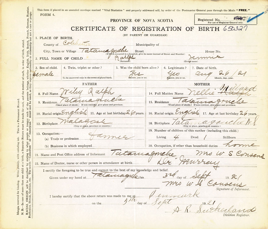 21. Name and Post Office address of Informant Mrs. W. S. Cousens Tatamagouche, Colchester