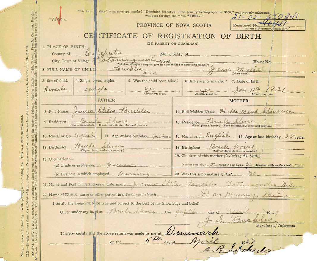 21. Name and Post Office address of Informant James Stiles Buckler Tatamagouche
