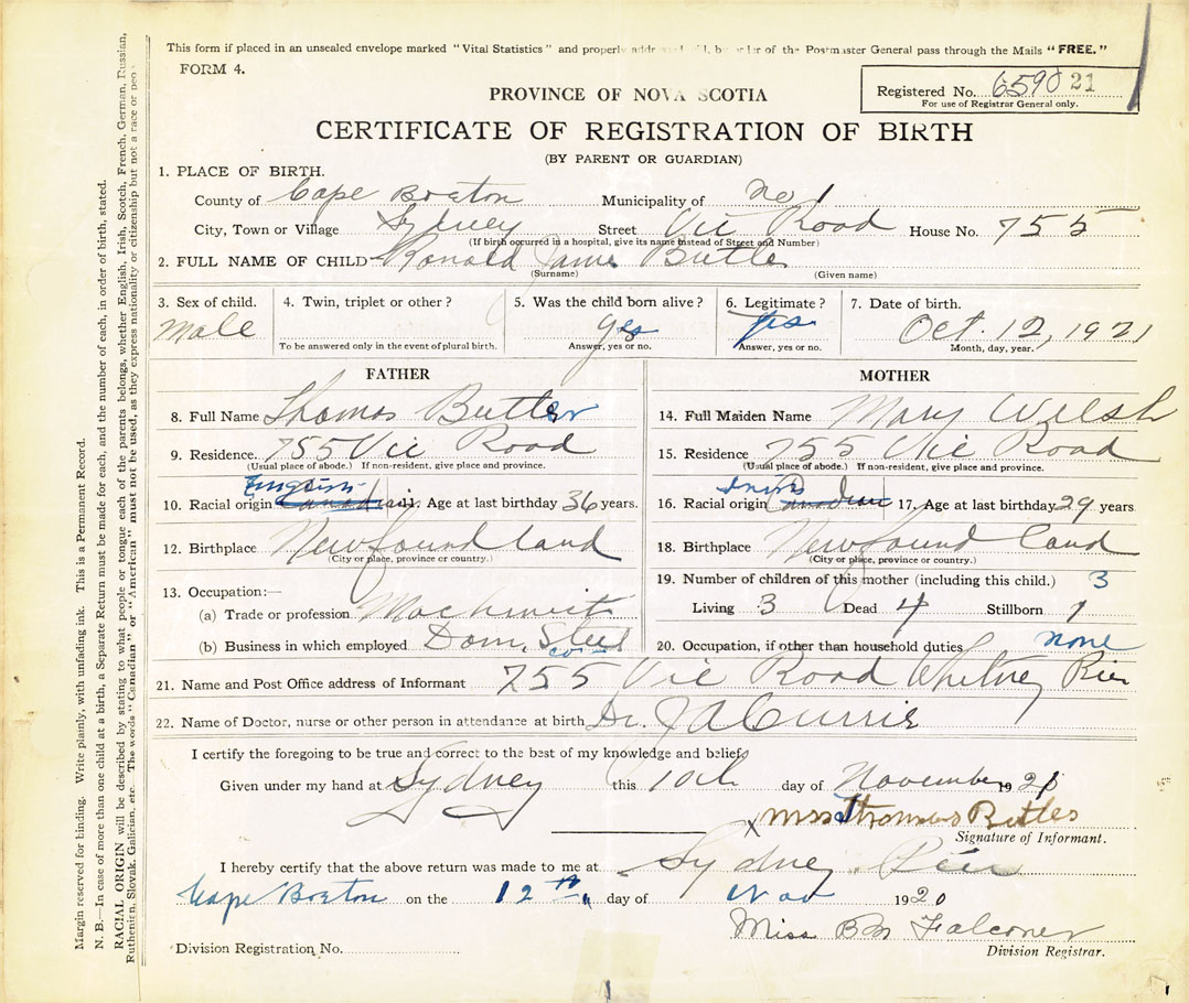21. Name and Post Office address of Informant Mrs. Thomas Butler 755 Vic Road, Whitney Pier