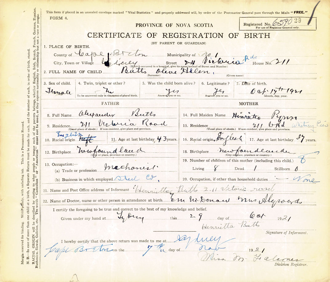Female Birth Registration: Year: 1921 number: 65900029