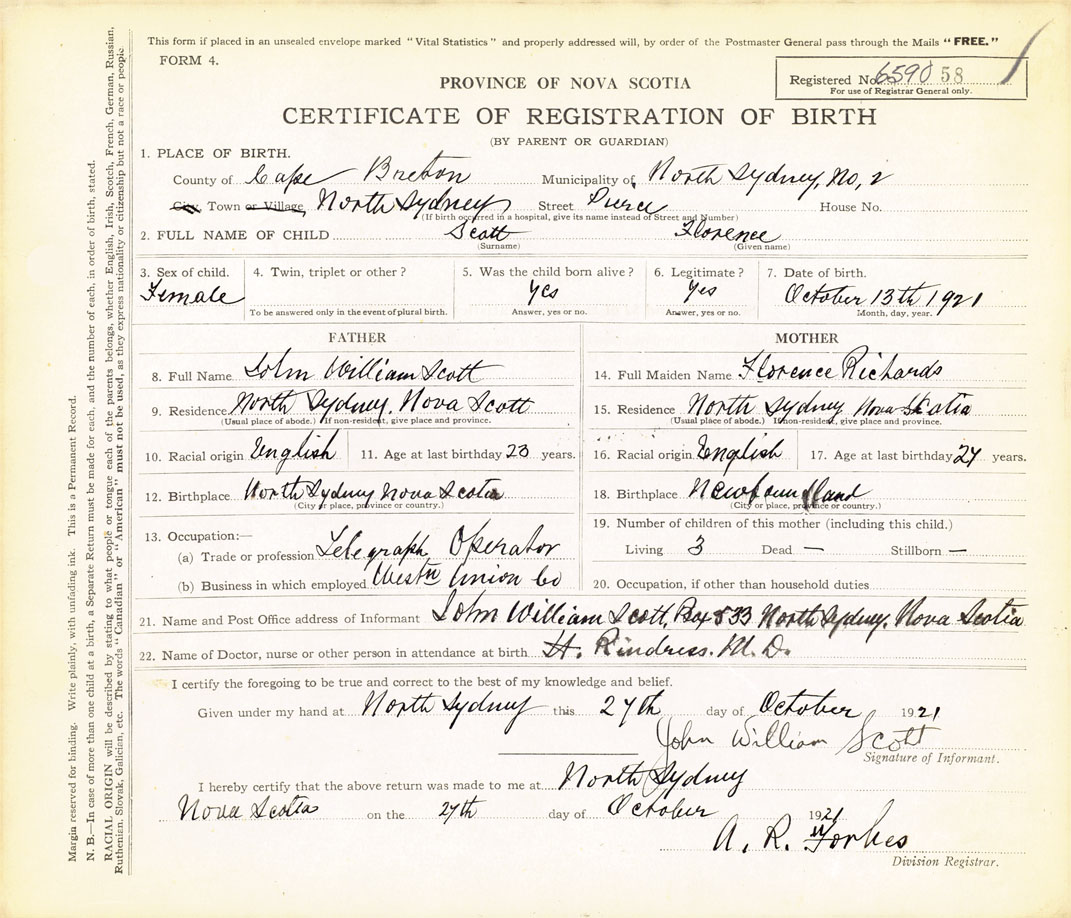 Female Birth Registration: Year: 1921 number: 65900058