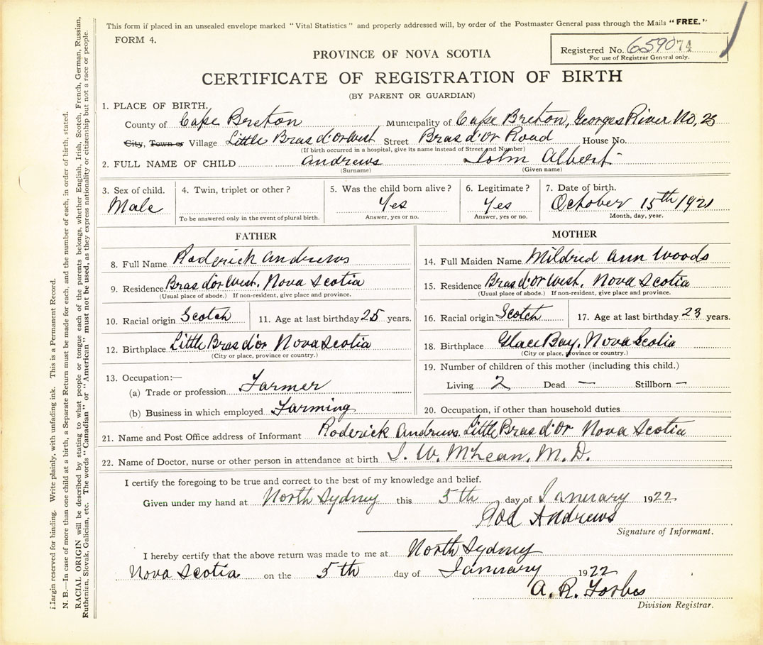 21. Name and Post Office address of Informant Roderick Andrews Little Bras d'Or