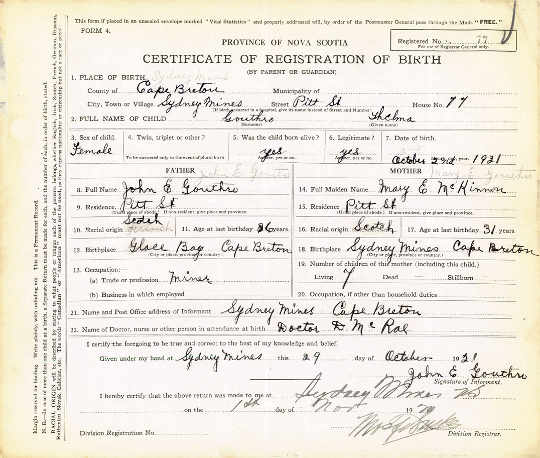 21. Name and Post Office address of Informant John E Gouthro Sydney Mines, Cape Breton