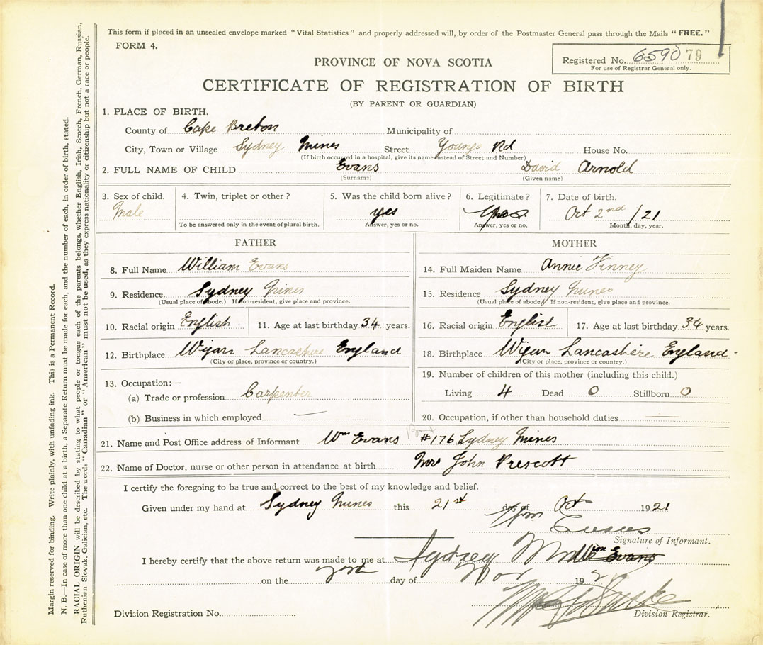 21. Name and Post Office address of Informant William Evans Box 176, Sydney Mines, Cape Breton