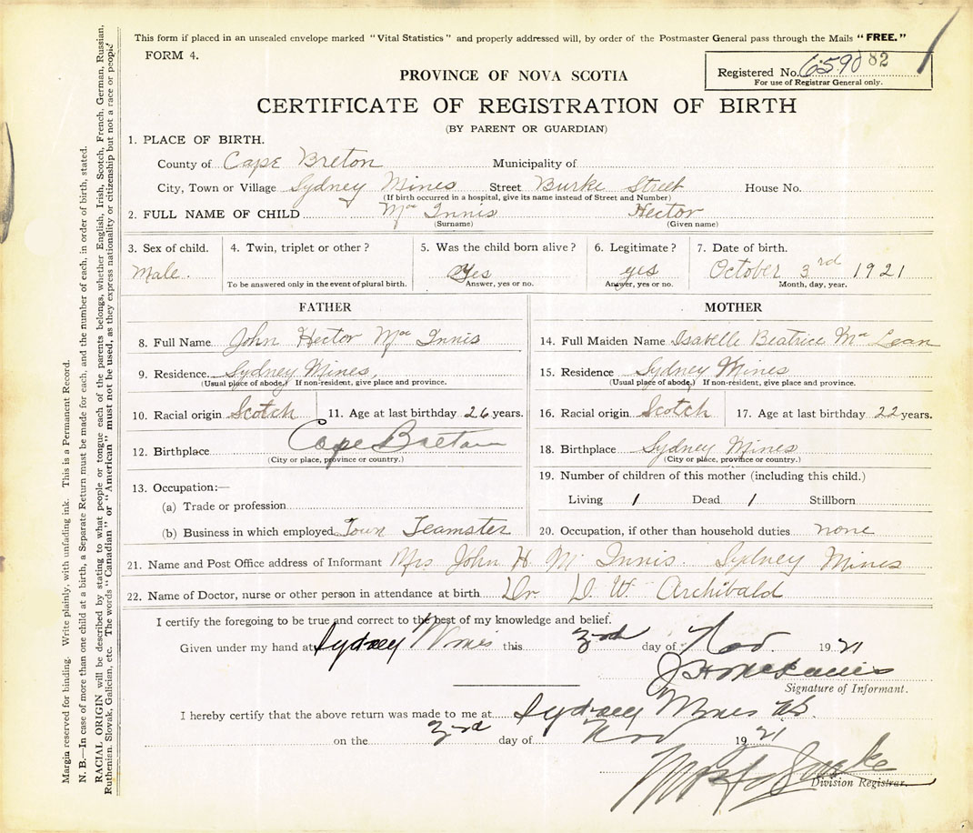 21. Name and Post Office address of Informant Mrs. John H. McInnis Sydney Mines, Cape Breton